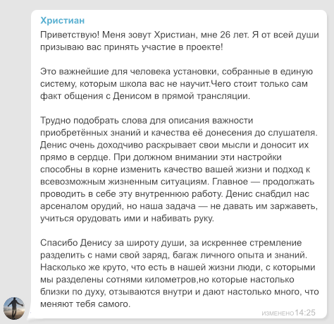 Ваш путь внутреннего развития будет проходить через продолжительную работу по постепенному изменению ваших точек зрения на мир и на себя. Именно эти точки зрения я подробно объясняю в рамках курса.